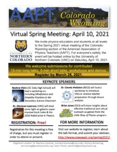 The 2021 Spring meeting of the Colorado/Wyoming section of the AAPT is hosted by the University of Northern Colorado (UNC) and will be held virtually online on Saturday, April 10, 2021. In our physically-distant world, we want to bring together physics educators and students at all levels, in virtual spacetime, for a chance to exchange …